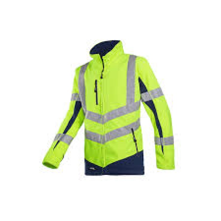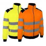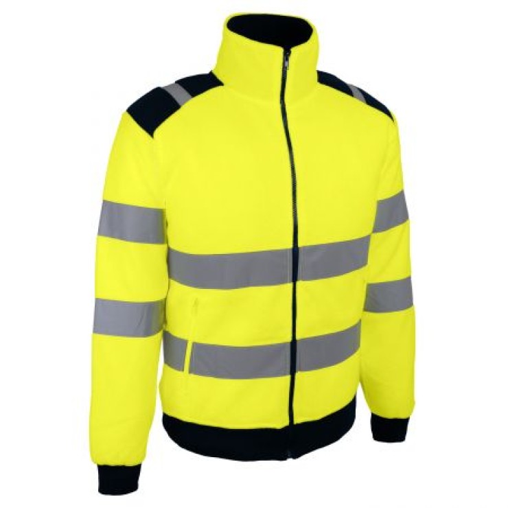 Veste polaire fluorescent. Bandes : 2 bandes baudriers rétro réfléchissante, 2 ceintures, 2 brassards par manche et 2 bretelles dos et devant). Fermeture simple glissière en plastique avec curseur métal jusqu'en haut du col. Col droit. Mauches amovibles terminées par poigniet réglabes par élastiques de serrage. 2 poches basses fermeture à glissière verticale, 1 poche haute v