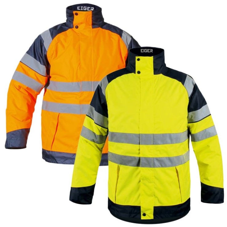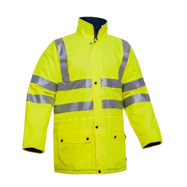 Parka haute visibilité. Matière extérieure en polyester non respirant, 300D polyester Oxford enduit PU imperméable fluorescent. Bandes : bandes rétro réfléchissante cousues, 2 ceintures, 2 brassards par manche et 2 bretelles dos et devant). Capuche intégrée dans le col avec fermeture cordons. Fermeture parka à glissière avec rabat pression. Col marine droit. Poches extérieur...